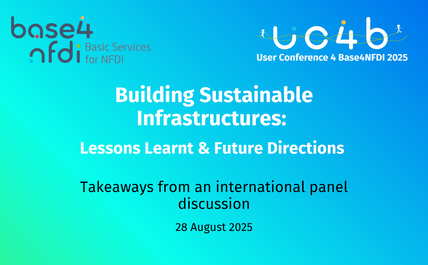 Dear colleagues in the NFDI and beyond,as many of you already know, the first Base4NFDI User Conference (UC4B) will take place in Berlin on November 20/21, 2024.We cordially invite you to contribute to the conference program with this call.Please feel free to distribute the call in your sections, consortia, basic service teams and other relevant groups.