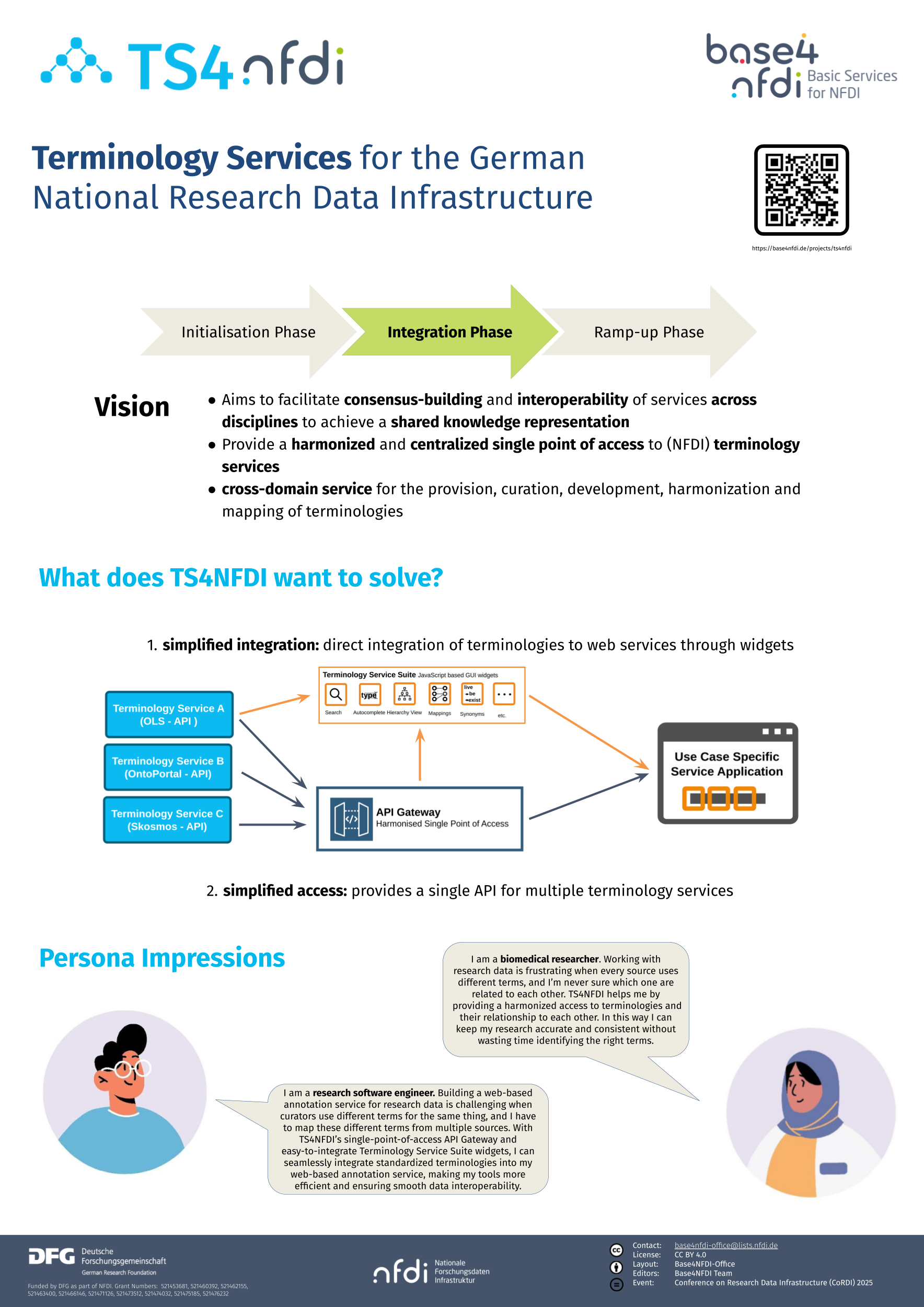Currently TS4NFDI is in the initialisation phase with the following goals: to create a comprehensive overview of all consortia and the terminologies and related services in use – as well as their requirements and relevant use cases. Based on the development of a detailed architecture, a first pilot should at least integrate three different terminology service platforms into an aligned terminology service backend.